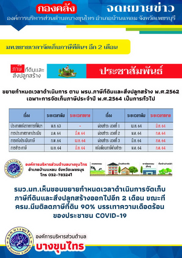 องค์การบริหาร่ส่วนตำบลบางขุนไทร พิจารณาแล้วเห็นว่าไม่สามารถดำเนินการเก็บภาษีที่ดินและสิ่งปลูกสร้างประจำปี พ.ศ.๒๕๖๕ ได้ตามระยะเวลาที่กฎหมายกำหนดได้เนื่องจากการแพร่ระบาดของโรคติดเชื้อไวรัสโคโรนา ๒๐๑๙ จึงอาศัยอำนาจตามมาตรา ๑๔ วรรคแรกแห่งพระราชบัญญัติภาษีที่ดินและสิ่งปลูกสร้าง พ.ศ.๒๕๖๒เห็นควรให้ขยายเวลาดำเนินการตามกำหนดเวลาในพระราชบัญญัติภาษีที่ดินและสิ่งปลูกสร้าง พ.ศ.๒๕๖๒ เฉพาะการจัดเก็บภาษีที่ดินและสิ่งปลูกสร้างประจำปี พ.ศ.๒๕๖๕ ออกไปดังนี้